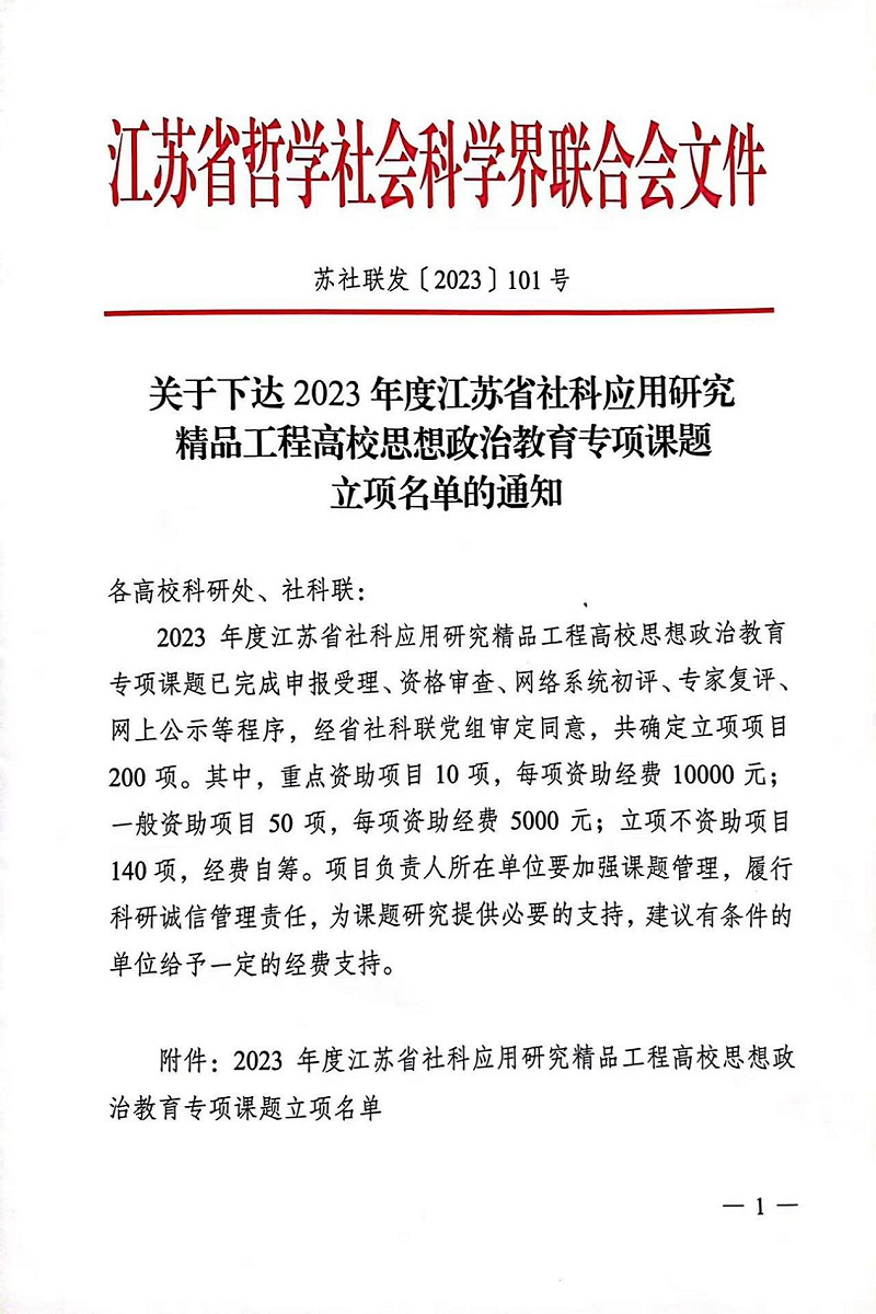 近日,江苏省社会科学联合会公布了“2023 年度应用研究精品工程高校思想政治教育专项课题”立项项目名单,本年度社科联共确定立项项目200项。其中,重点资助项目10项,一般资助项目50项,立项不资助项目140项;我院蔺新茂院长的专项课题《知与行:高校体育课程思政融入育人全过程的理论与实践机制研究》以一般资助项目第四名获得立项。