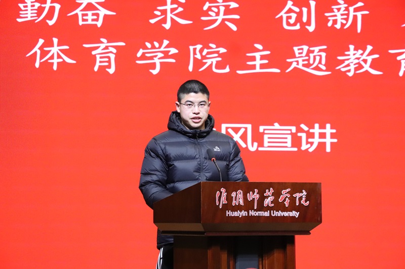 动员会后,体院举行了“勤奋 求实 创新 奉献”主题教育月学风宣讲和安全稳定工作教育。考研优秀学生代表李鑫同学和大家分享大学期间成长的心路历程;学院团委副书记邱硕同学宣读了安全倡议书。在总结安全稳定工作时,党委副书记周翔要求全体同学都能遵纪守法,坚决不碰“打架斗殴、考试作弊、使用违规电器”等几类高压线。平时都要脚踏实地,内强素质、外塑形象,以后要在实现民族复兴的赛道上奋勇争先。