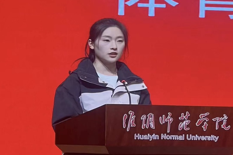 学生代表朱真真从“勤奋”、“求实”、“创新”、“奉献”四个方面表态:作为体院学生,应向下扎根,向阳生长,以全新的姿态启航,奔赴“百花齐放春满园”的盛会!