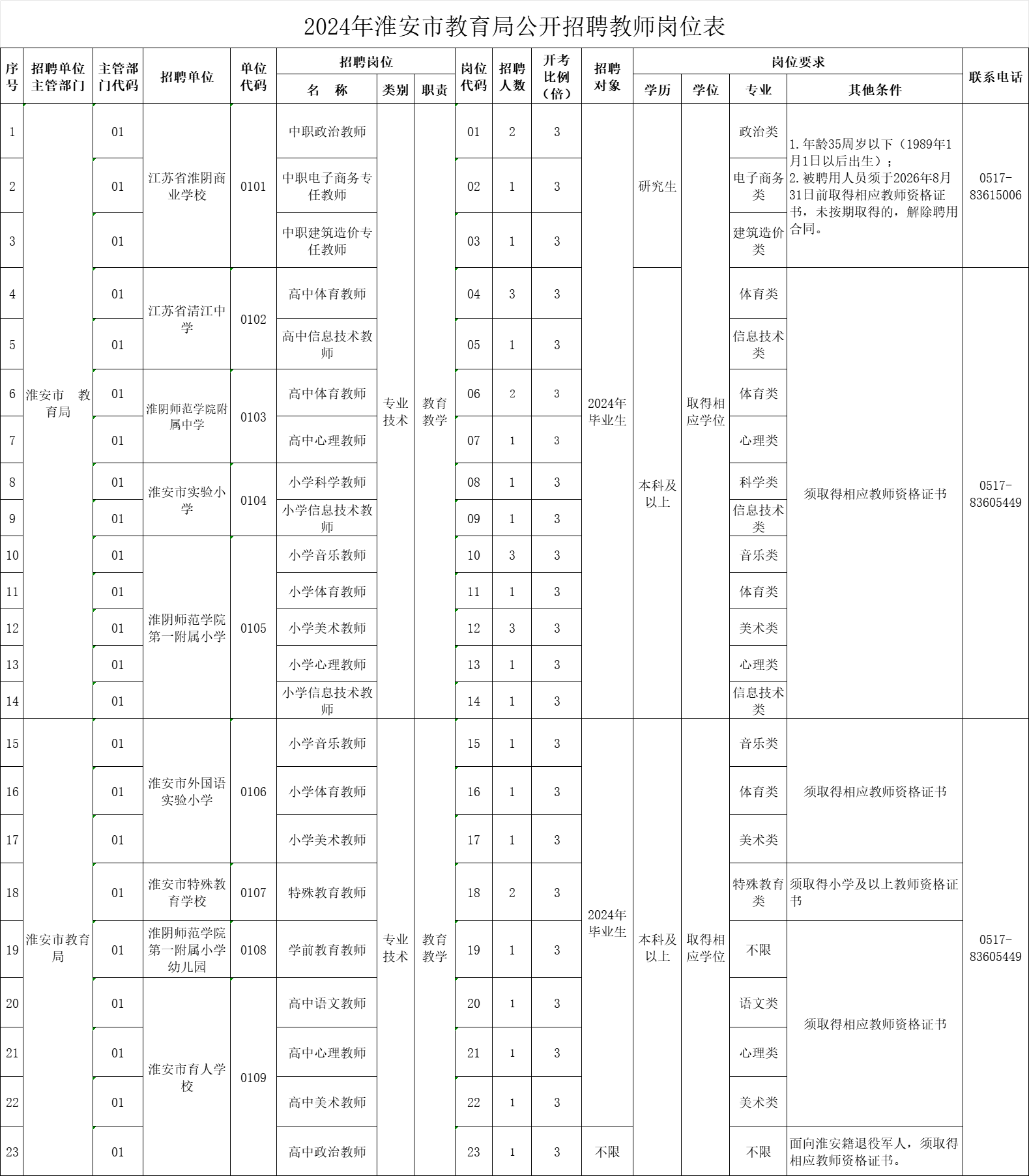 7月15日,2024年淮安市市直及盱眙县部分学校公开招聘教师公告发布,面向社会公开招聘教师55人(事业编制),本次招聘的报名工作通过网络进行,不接受现场报名。
