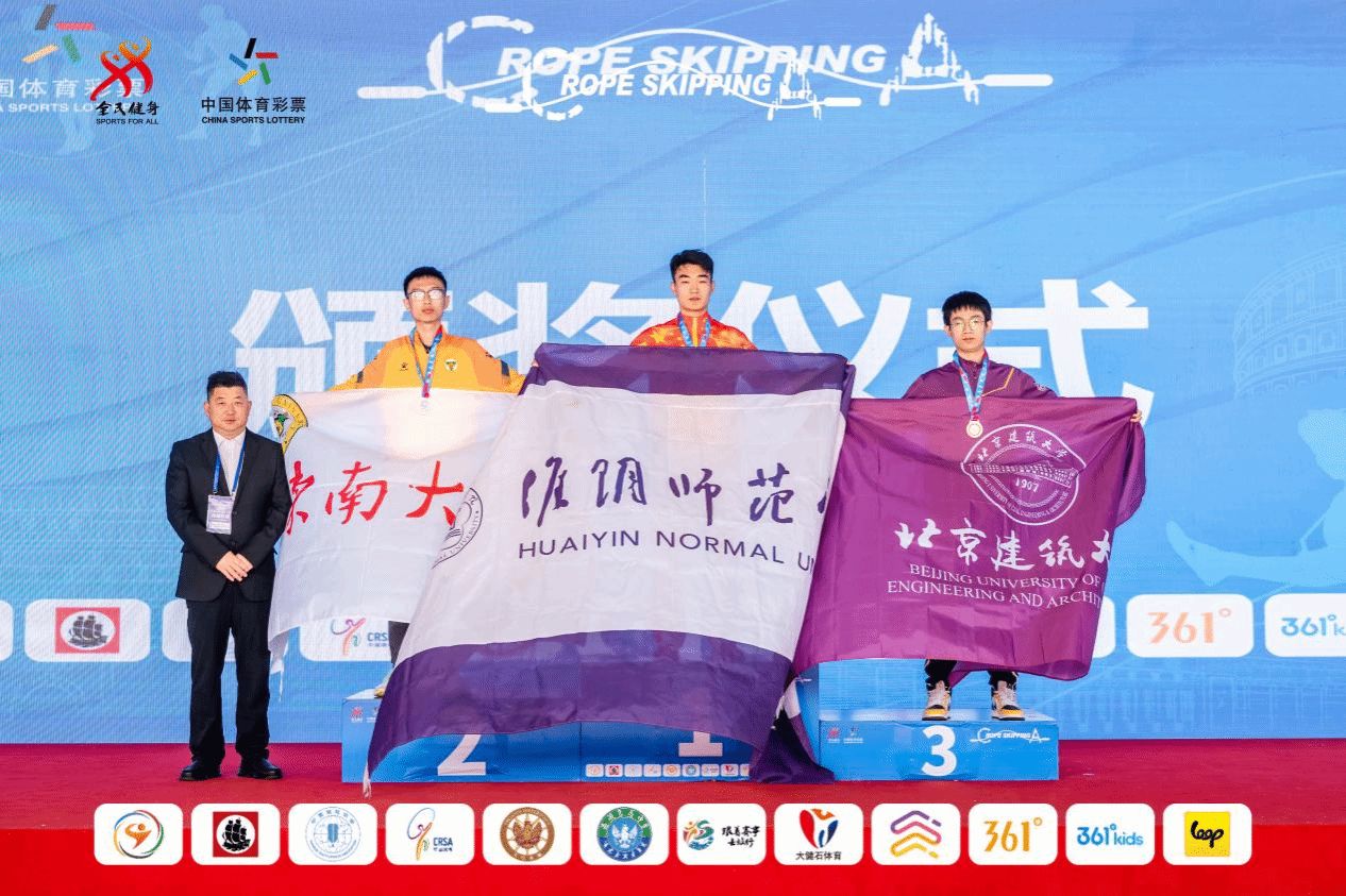 2025年全国跳绳联赛(江苏江阴站)于5月9日-12日,在江阴海澜飞马体育公园中国馆隆重举行。此次比赛由朱世杰老师担任教练。淮阴师范学院代表队斩获1分钟10人长绳集体跳第一名、女子组一分钟并脚跳第一名、4×30s交互绳接力第一名、女子组30秒1带1第一名、女子组3分钟单摇第一名、男子组连续三摇跳第一名、男子组2×30s双摇接力第二名、女子组30s单摇第二名、女子组2×30s双摇接力第三名、男子组三分钟单摇跳第四名、男子组1分钟并脚跳第四名、女子组1分钟并脚跳第四名、女子组1分钟并脚跳第五名、男子组三分钟单摇跳第五名、男子组30s单摇第五名、女子组30s单摇第五名、男子组30s交叉单摇第六名、女子组30s交叉单摇第八名的优异成绩。