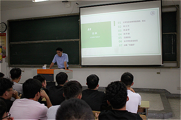 本次安全课,景老师意在激发大学生树立安全第一的意识,确立正确的安全观,并努力在学习过程中主动掌握安全防范知识和主动增强安全防范能力。景老师利用文字,图片,视频。主要向大一新生讲述了有关个人财务安全保管,防火,防电,防骗,个人出行交通安全。