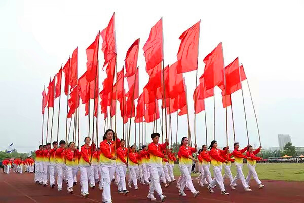 在雄壮有力、富有朝气的运动员进行曲中,校徽、校旗、彩旗方阵、裁判员方阵,以及来自17个二级学院、继续教育学院、后勤服务集团、机关、图书馆、离退休的运动员方阵代表昂首阔步,斗志昂扬地走过主席台。