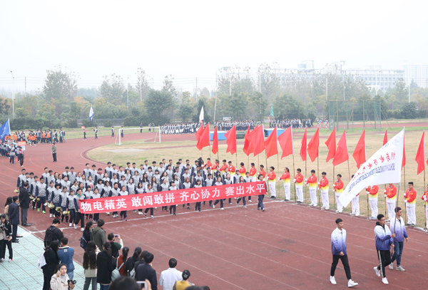 在雄壮的运动员进行曲中,国旗、校旗、会徽、军鼓乐团、铜管乐团、彩旗、裁判员等方阵依次入场。来自研究生院及17个二级学院的运动员代表方阵迈着矫健的步伐,朝气蓬勃地走过主席台。