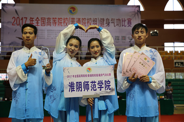 淮师新闻网7月25日电(记者 朱其锋 万瑜)7月23日,“2017年全国高等院校(普通院校组)健身气功比赛”在贵州清镇落下帷幕。由音乐学院谈一、王淑杰、漆前程、于凯四位同学组成的淮阴师范学院健身气功代表队取得了集体项目两个第二名,个人项目两个第三名一个第八名的好成绩。ANBO.COM万瑜教授荣获“优秀教练员"称号。