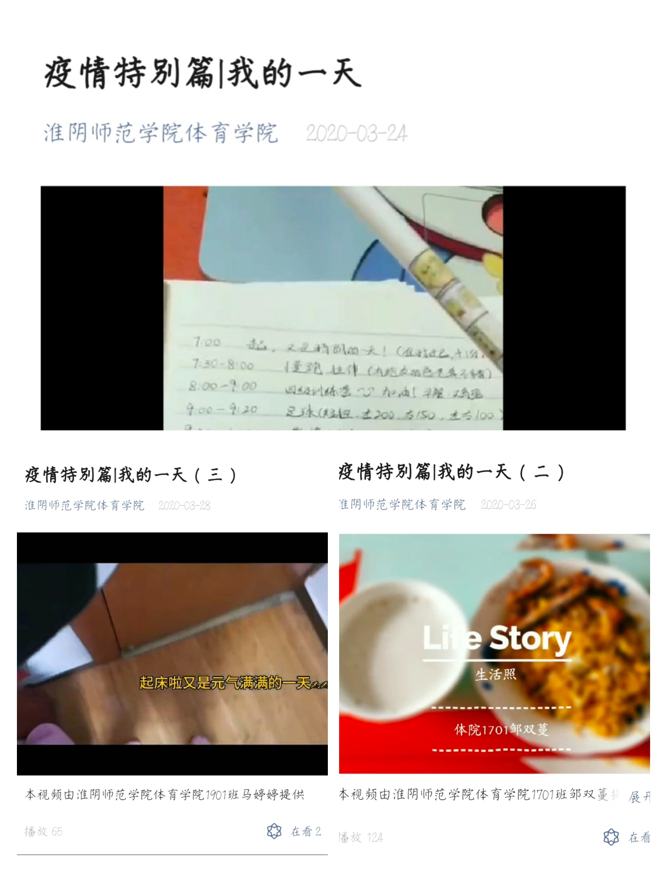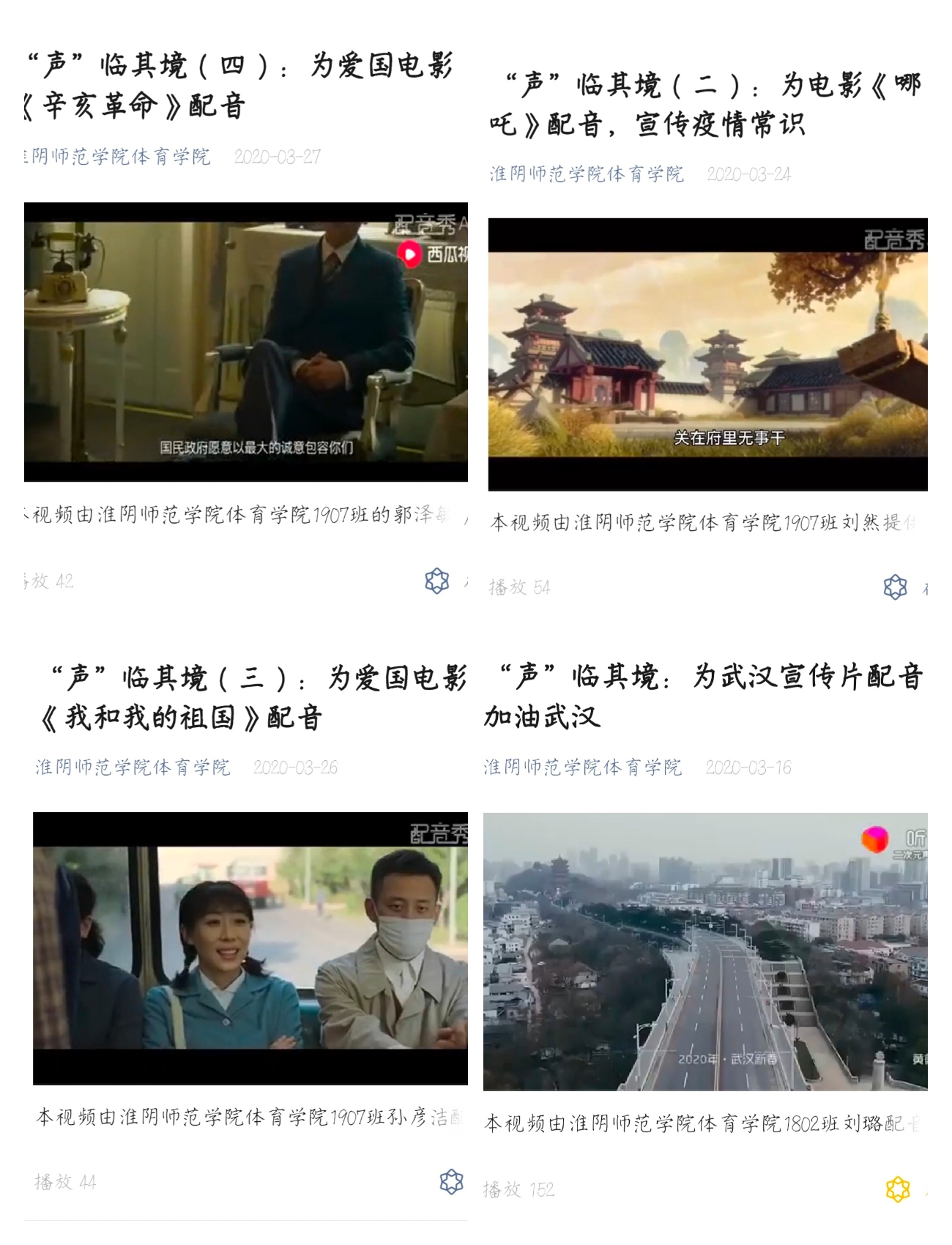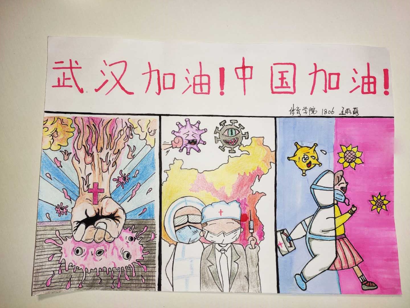 同学们一笔一画制作了“为白衣天使加油”、“为武汉加油,中国加油”等问候语,配上温馨的图画;录制一天生活色彩,展示自己宅家真实生活写照;“声”临其境,为爱国电影配音。优秀作品通过学院微信推送,让全体同学坚定同心战“疫”的决心,为早日打赢防疫阻击战加油助力!