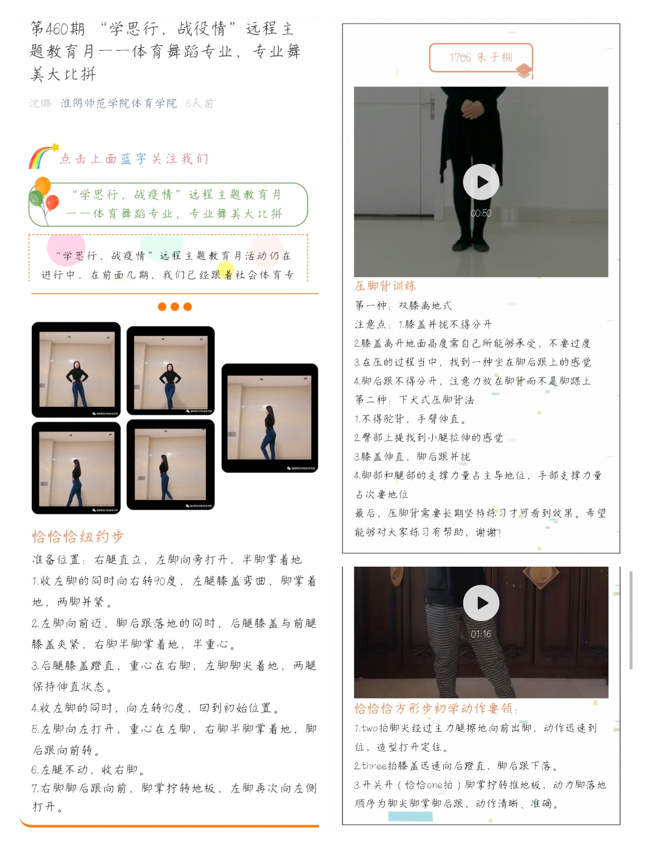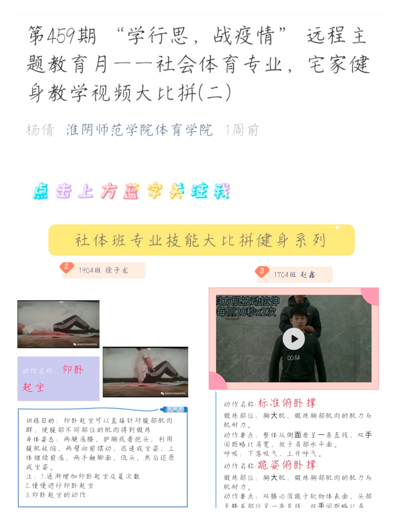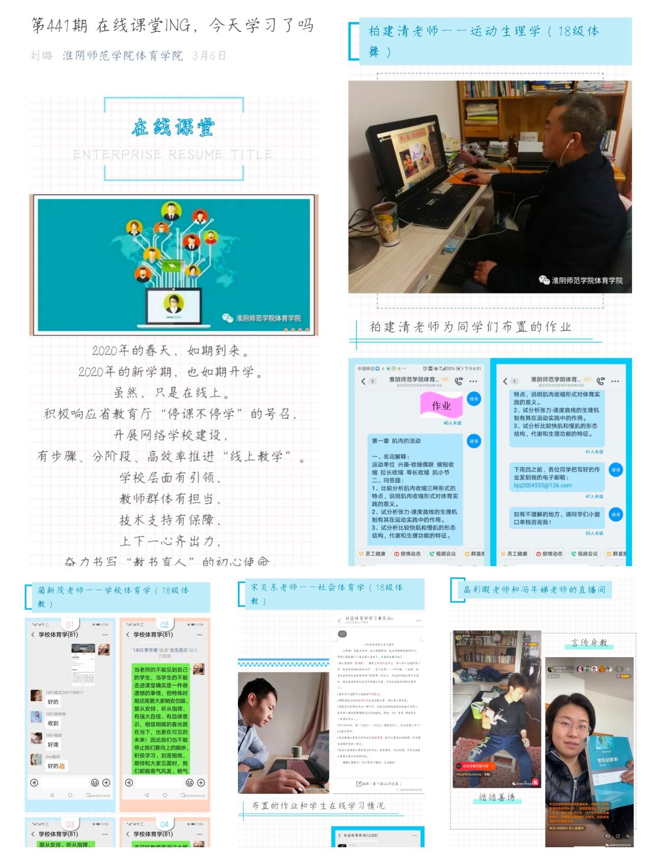 学院运用QQ、微信等新媒体平台开展疫情防控知识线上专题宣讲;教师通过爱课程、中国大学mooc、超星、智慧树、微信等软件实现在线教学;社会体育专业同学发挥专业特长在家录制简单易行的健身知识小课堂,倡导大家积极参加体育锻炼,养成健康生活方式;体育教育专业同学瞄准教师资格证面试、考编考研,利用疫情期间在家认真打磨一份教学教案,并分享学习成果;体育舞蹈专业同学发挥专业特长,进行“专业舞美大比拼”。