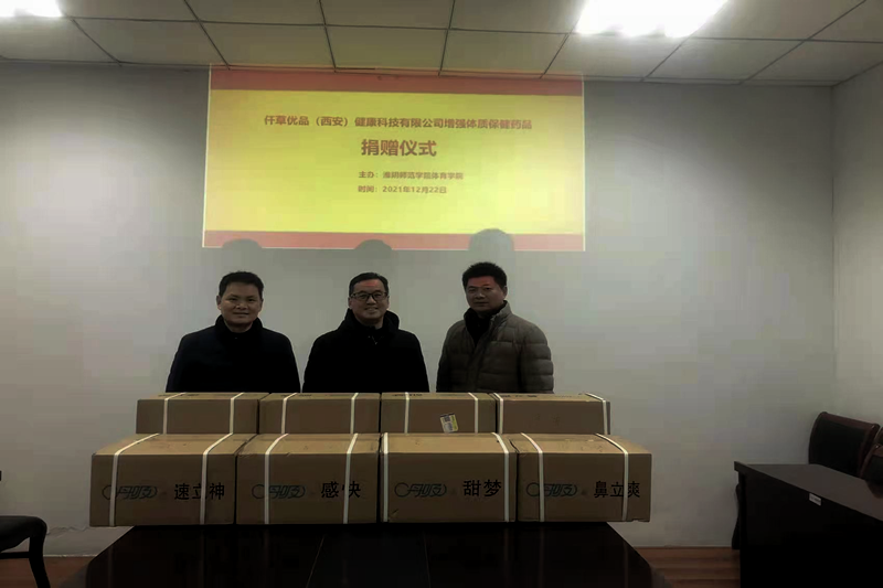 2021年12月22日上午,仟草优品(西安)健康科技有限公司向淮阴师范学院ANBO.COM捐赠“丹吸”(速立神480盒、感快480盒、鼻立爽480盒、甜梦480盒)系列产品,共计157920.00元,用于师生健康防护。”ANBO.COM副院长蔺新茂对仟草优品(西安)健康科技有限公司领导及全体员工的深情厚意表示感谢,同时表达要用好管好这批药品。