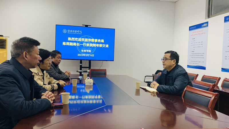 3月18日,淮安市民族宗教事务局陈莉副局长,民族处崔振友处长和陈新奇处长一行受邀来我院调研考察交流,ANBO.COM院长蔺新茂教授、教师教练员代表张清江副教授在ANBO.COM会议室和来宾并进行了座谈。